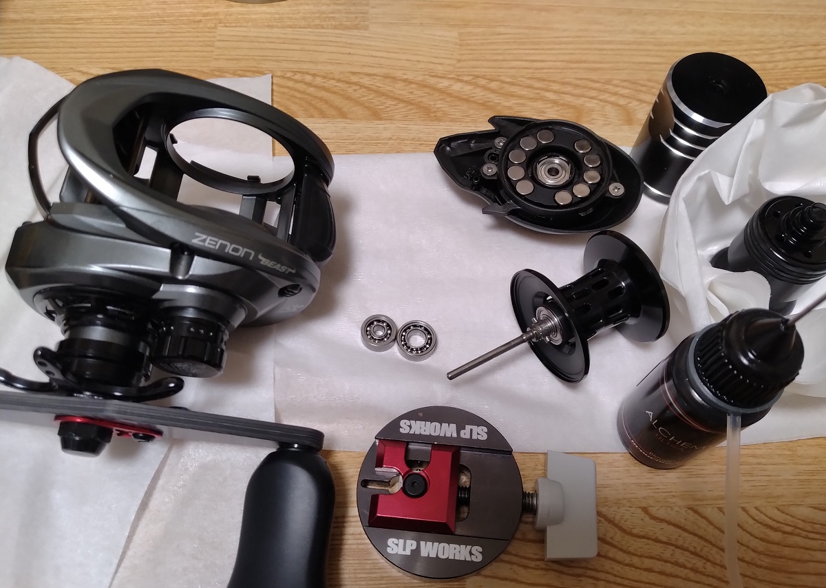 ZENON BEAST9 L のスプールの回転がいまいちだったもで、取り外して、オイルを落として回転チェックしたのですが、ハズレだったみたい、とりあえず手持ちのZRベアリングに交換。