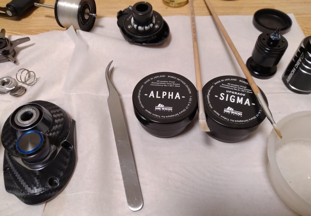 ドラグワッシャーとピニオンギヤを上下させる可動部、クラッチ可動部なとにアルファグリスを使用、すごくしっとりしてるのに、柔らかい使用感のクラッチになり、純正グリスだと、たまに半クラッチになる事が有ったのですが、それも改善されました、